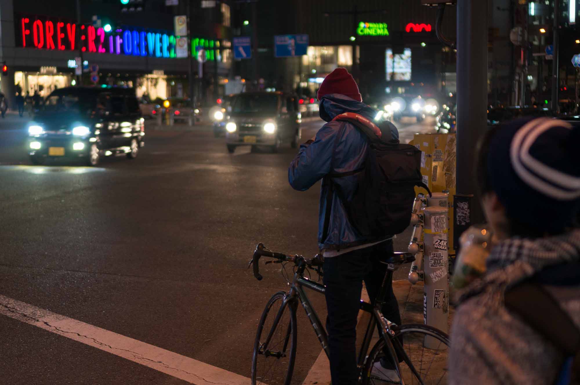 A biker waits for the lights to change near Shinjuku Sanchome.