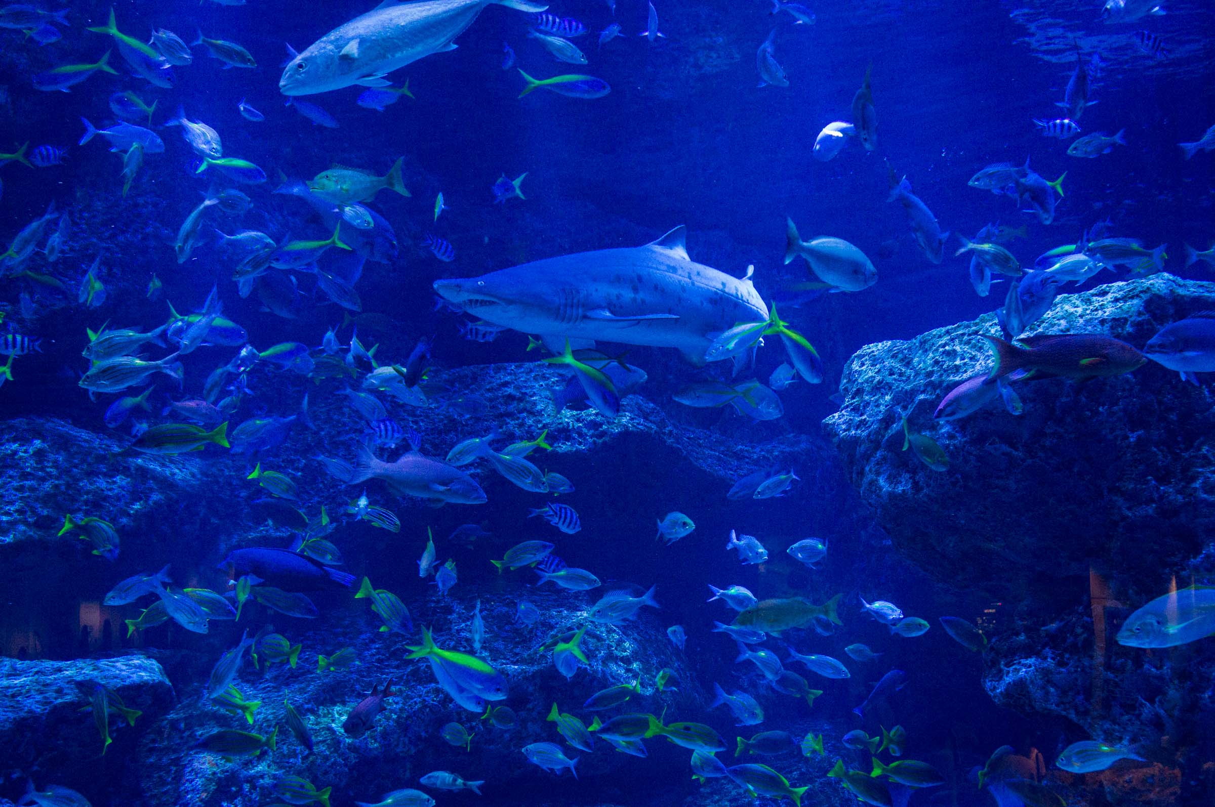 Black lights illuminate the tanks filled with colorful tropical marine life.